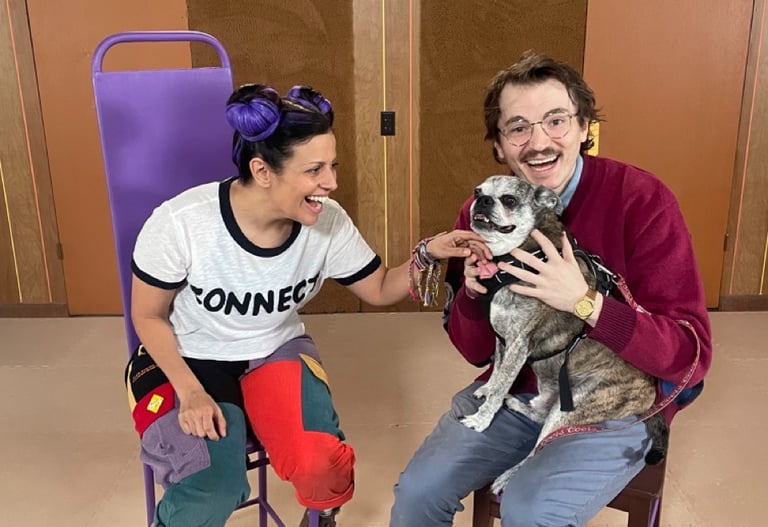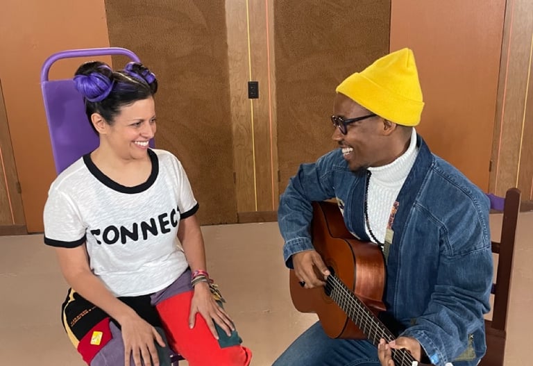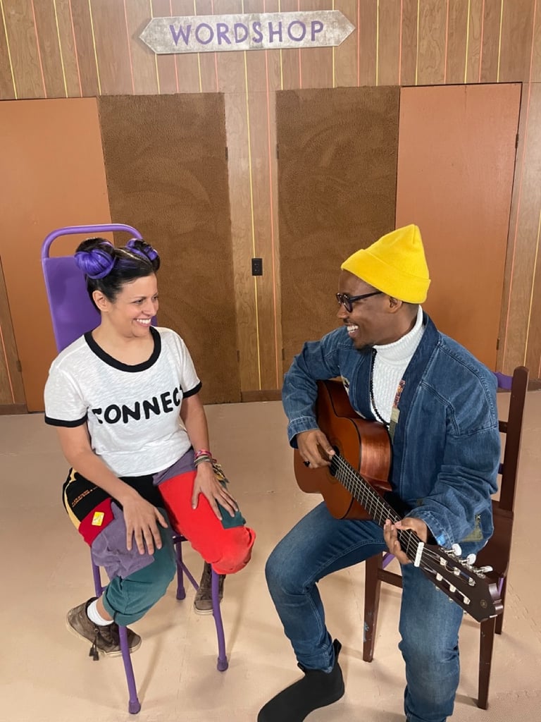 The iconic grass floor and classic sports gear decor suggest fun and play, setting the stage for this interactive movement segment where the audience joins in. Dancing, jumping, stretching and dramatic play offer physical avenues to deepen children's understanding of words.
